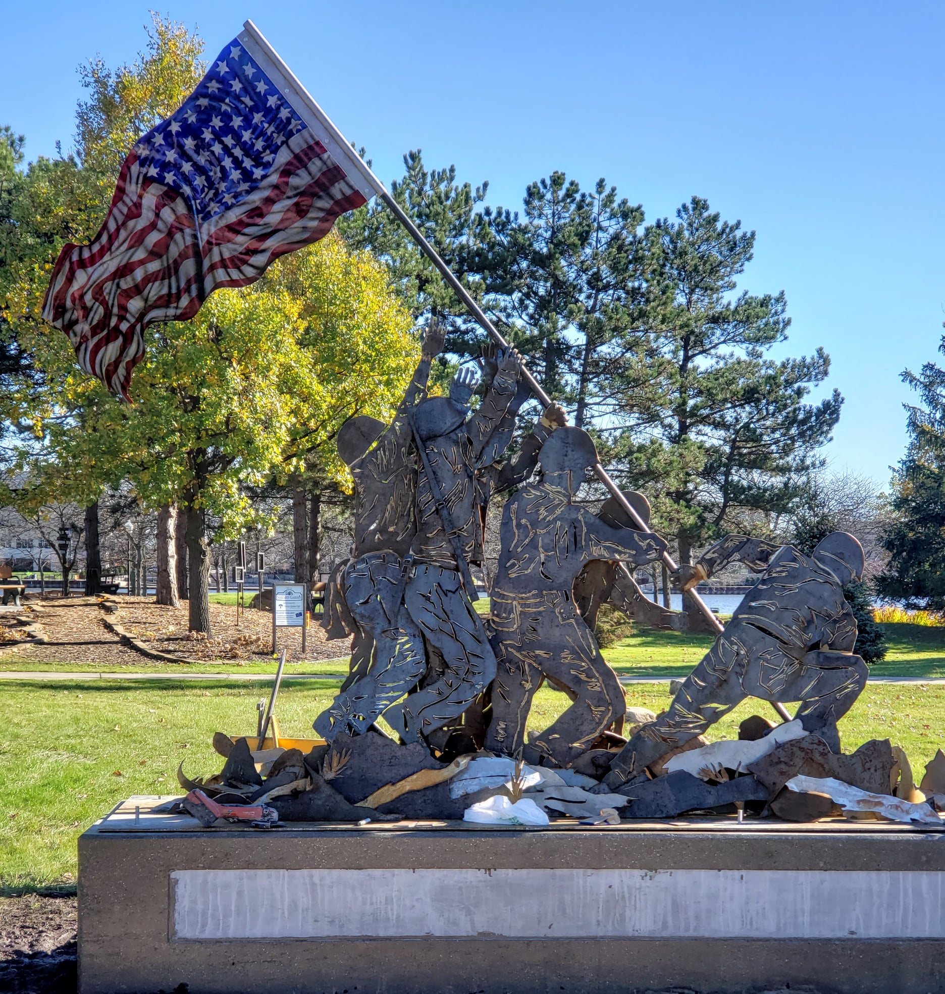 NEW for 2021, the Iwo Jima memorial is a life-size metal rendering of the flag raising on Iwo Jima from World War II, created by Michigan artist Matt MacPherson. We plan to expand this memorial into a full plaza experience soon Click here to learn more and support this project!